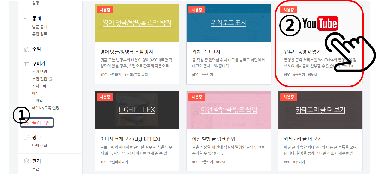 그곳에서 ②과 같이 '유튜브 플러그인'을 눌러서 적용을 하면 아래와 같이 사용중으로 바뀝니다. 그럼 완료!