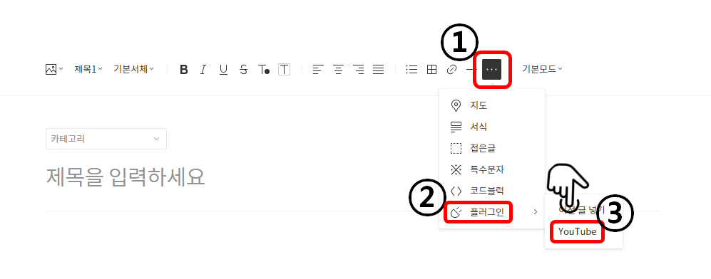 '글쓰기'→'①더보기'→'②플러그인'→③YouTube(클릭)' 아래와 같이 [1,2,3]의 순서대로 진행합니다.