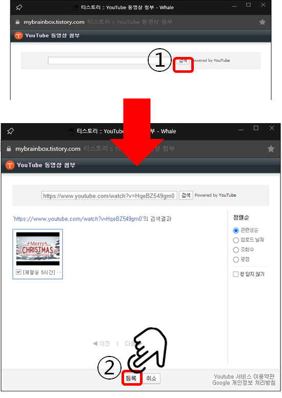 4. '①검색을 클릭, 유튜브 URL주소를 입력 → ②등록'을 누르면 됩니다.
