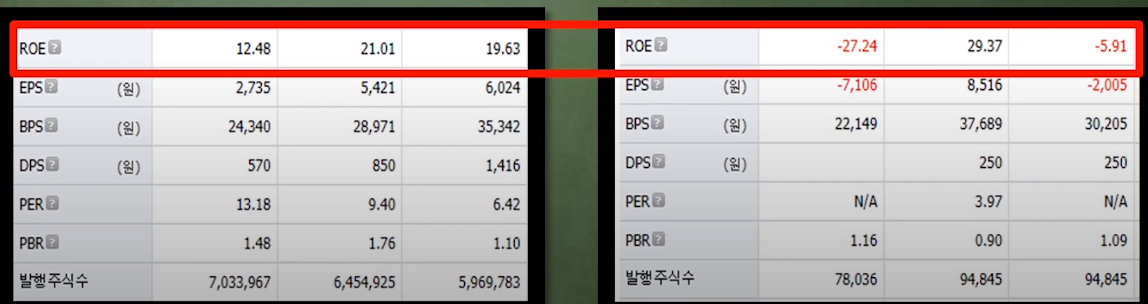 :내 자본이 적을 수록, 당기순이익이 높을 수록 좋은 것. 즉 ROE가 놓은 것이 좋음