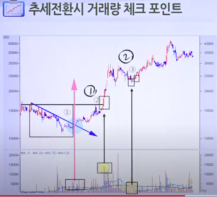 ③추세전환 후 조정 시 거래급감 시점에서 매수관점 접근