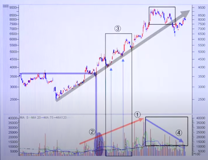 ②상승하던 주가가저항선이나 전고점을 넘어서기 위해서는 이전의 거래량을 상회하는 대략의 거래가 나타나며