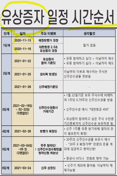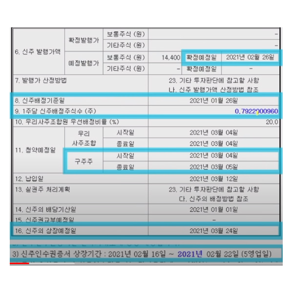 ▶1주당 신주배정주식수(주) 0.7922000960 ▶신주인수권증서 거래기간(2/16~2/22) 시작일: 2021년 3월 4일 ←유증참여 시 3월 4일 전에는 계좌에 돈이 들어와있어야 함 종료일 2021년 3월 5일 ▶신주의 상장예정일: 2021년 3월 24일 |