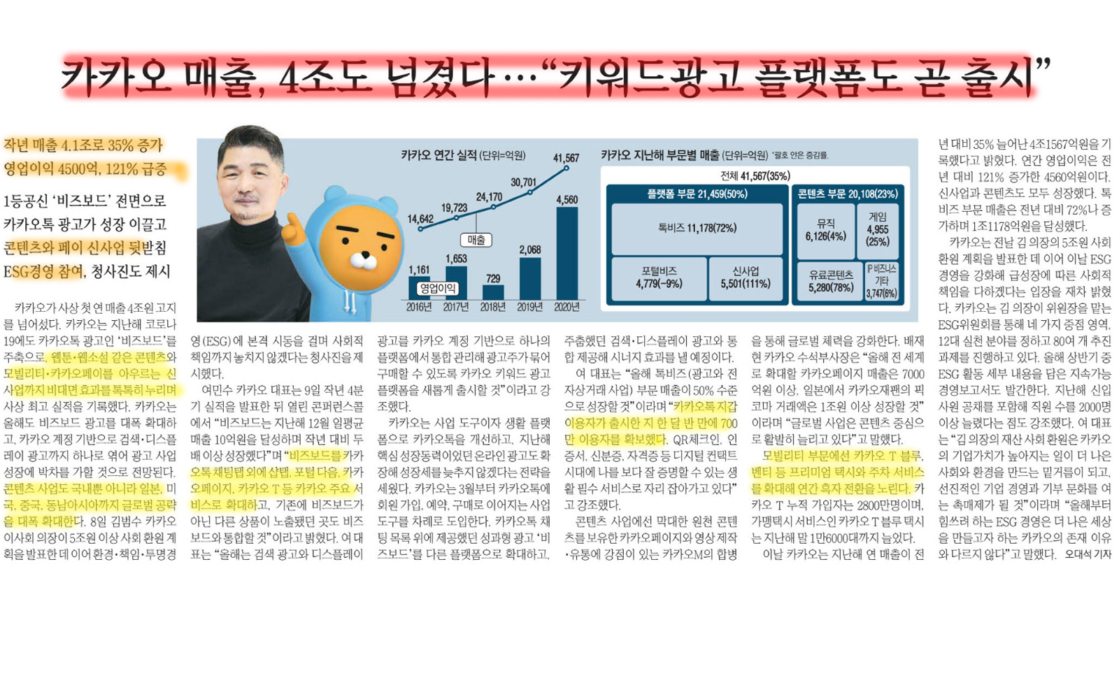 -카카오 매출 4조 돌파, 매출 35% / 영업이익 4500억(121%증가)